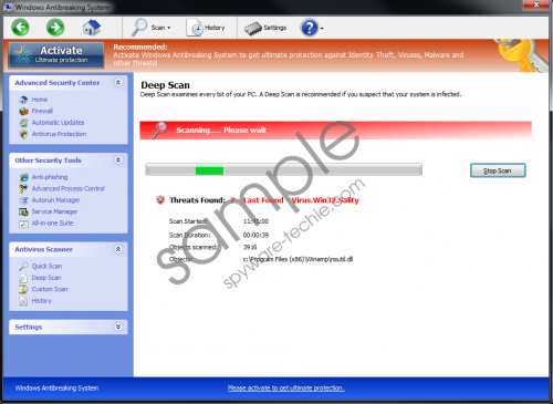 Windows Antibreaking System is fake software which is made by cyber crooks to make you think that the computer’s system is infected and that you need to make a purchase of its imaginary full version which will remove the simulated threats. Get rid this counterfeit application in order to prevent financial data loss.