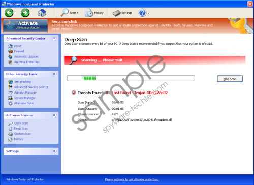 In addition, Windows Foolproof Protector is more persistent than you may think. The rogue initiates imaginary scans and provides you with simulated results saying that the system is under threat. Fake Trojans and other imaginary infections are presented as terrible threats damaging your system and sending your sensitive information to third parties. For example, you will get a list of such “threats” as Server-FTP, Trojan-DDoS.Win32, Trojan-Clicker and others. Moreover, do not get hooked on the fake notification given at the bottom of the scan table saying that: