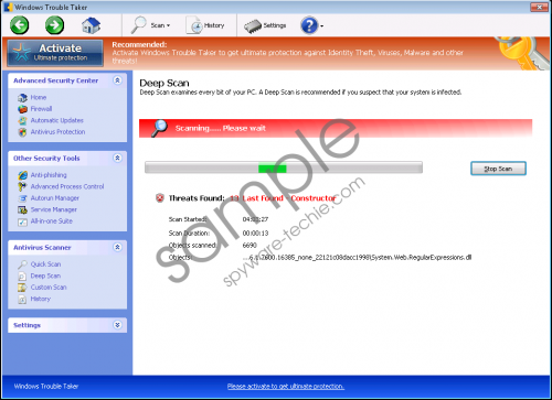 Windows Trouble Taker is a dangerous computer threat that will rob you in no time if you are not cautious about it. It is a rogue antispyware application and it has been designed to look just like a reliable antimalware program. Windows Trouble Taker manages to deceive a lot of users because of its appearance, just like the rogues before it, including Windows Managing System, Windows Debug Center, Windows No-Risk Agent and many others. All of these rogues looks identical to each other and they managed to fool thee users, because they copy the layout of Windows XP’s explorer. Thus, Windows Trouble Taker seems to be an extension of the operating system and an inexperienced user does not question it.